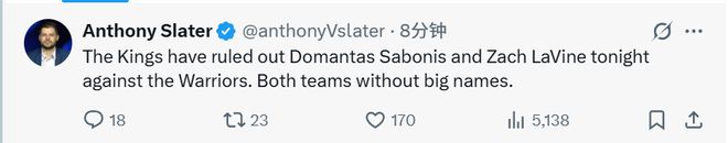 北京時間11月6日,國王主場對陣勇士。國王后衛拉文(背部傷勢)與前鋒小薩博尼斯(肋骨傷勢)均將缺席今晚的比賽。勇士一方的庫里已經提前確定無緣本場比賽,這是背靠背的第二場,而且他的感冒加重了。巴特勒因腰部拉傷也將缺陣。